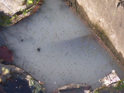 Culex quinquefasciatus larvae and pupae in a drainage ditch. “I encountered [these] mosquito populations so numerous that they completely filled the entire surface of the water. I’d wave my hand over the water, creating a shadow and thousands of larvae would instinctively and simultaneously respond by diving to the bottom of the ditch.” |