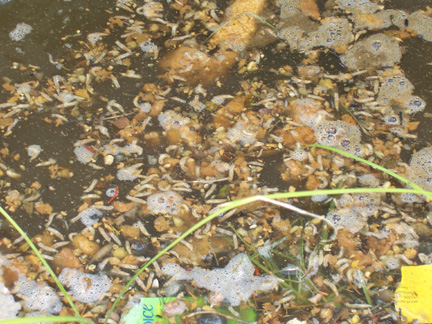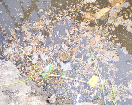 Rat-tailed maggots clumped together in a drainage ditch. “We saw many different species of filth flies. Blow/bottle flies and rat-tailed maggots were the most noticeable, due to their large size.” |