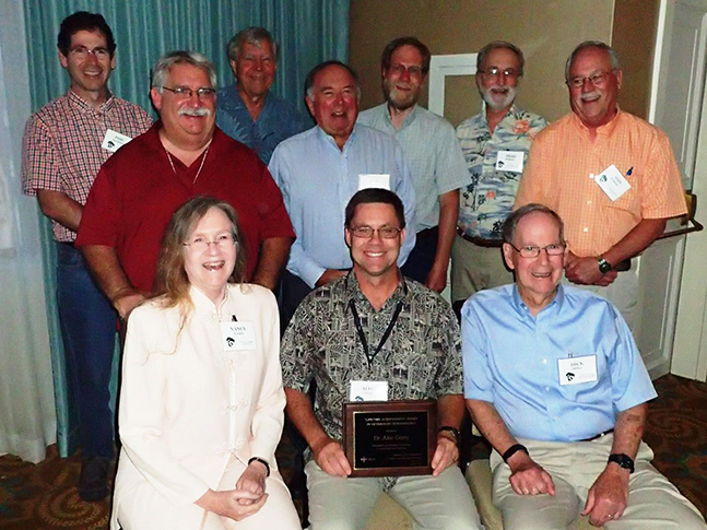 At the 61st Livestock Insect Workers Conference in Savannah, Georgia, in June 2017, Alec Gerry, Ph.D., cooperative extension specialist and professor of entomology at the University of California, Riverside received the 2017 Lifetime Achievement Award in Veterinary Entomology, recognizing his outstanding contributions to animal health and productivity. Pictured above are Gerry (front row, middle) and several former recipients of the award (front row, left to right: Nancy Hinkle, Gerry, and Dick Miller; back row, left to right: Phil Kaufman, Chris Geden, Jerry Hogsette, Don Rutz, Dave Taylor, Brad Mullens, and Wes Watson). (Photo credit: Annie Rich)